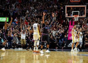 Dwyane Wade banked in a miracle shot — a 3-pointer at the buzzer off of one leg — as the host Miami Heat shocked the two-time defending NBA champion Golden State Warriors 126-125 on Wednesday night.